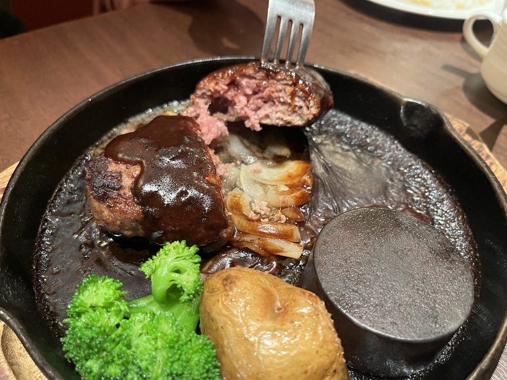 鉄板の音、立ち上る湯気、深い色合いのデミグラスソース。そして赤いナプキン。味だけでなく、五感すべてで楽しめる絶品ハンバーグです。買い物の合間のランチにも、ゆっくり味わう食事にもおすすめですよ。