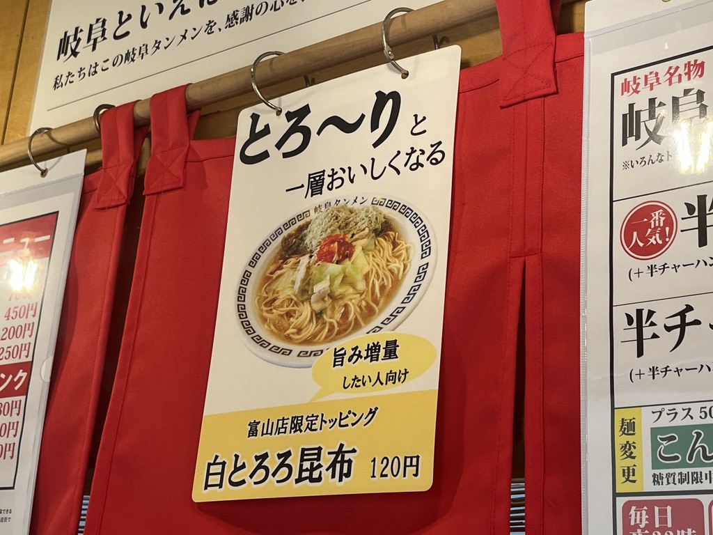 また、富山店限定のトッピングも。旨みが増量される「白とろろ昆布」!富山県民なら誰もが反応してしまいますね!とろろ昆布を岐阜タンメンのスープに潜らせてご飯といただくのも美味しいかも!全国にこのような地域限定トッピングなあるのでしょうか。他の店舗も巡ってみたくなりますね。