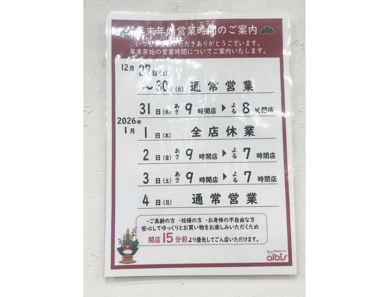 スーパーマーケットアルビスではほとんどの店舗が、2026年1月1日(木)休業、2025年12月30日まで通常営業。31日・2026年1月2日・3日が時短営業の店舗がほとんどとのことです。折込チラシによると1月2日(金)はアリス店は朝10時から、ミューズ店は朝9時30分から営業、また、ミューズ店、アリス店、アピア店は18時閉店です。詳細は公式サイトからご確認ください。