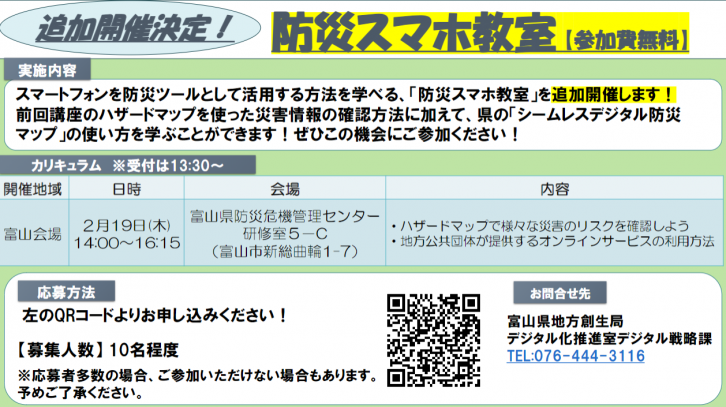【富山市】スマートフォンを防災に活用「防災スマホ教室」好評につき2026年2月19日に追加開催