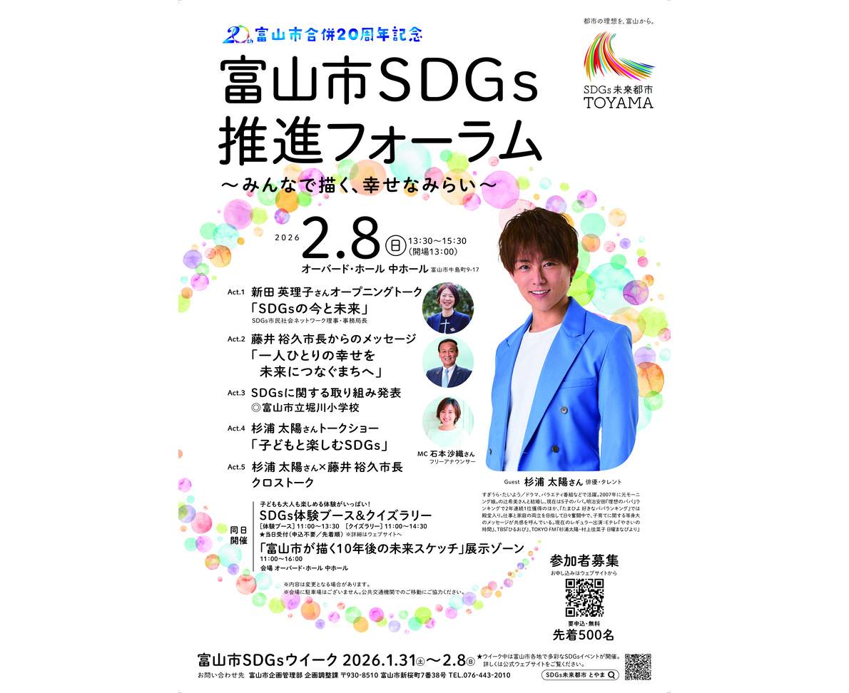 SDGsについて楽しく学び、考えるフォーラムが開催されます。「富山市SDGs推進フォーラム ~みんなで描く 幸せなみらい~」が、2026年2月8日(日)にオーバード・ホール 中ホールで行われます。