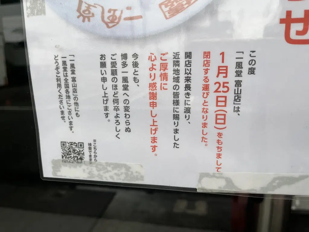 富山市二口町にあった一風堂 富山店が、2026年1月25日(日)をもって閉店することがわかりました。店頭には「閉店のお知らせ」と書かれた貼り紙が掲示されており、そこには「この度『一風堂 富山店』は、1月25日(日)をもちまして閉店する運びとなりました。開店以来長きに渡り、近隣地域の皆様に賜りましたご厚情に心より感謝申し上げます。」と、感謝の言葉が記されていました。一風堂といえば、博多発祥の本場仕込みの豚骨ラーメンで全国的に知られる人気店です。そして、富山県内ではこの富山店が唯一の店舗でもありました。