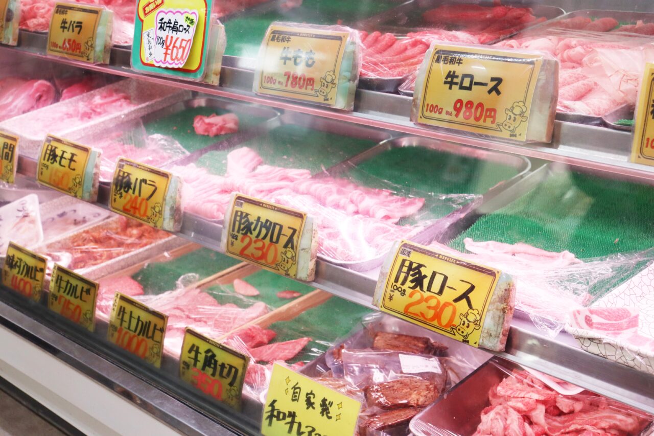 店内には新鮮な精肉がずらりと並び、自家製のお惣菜の種類も豊富。特別な日のご馳走から気軽な軽食まで何でも揃います。