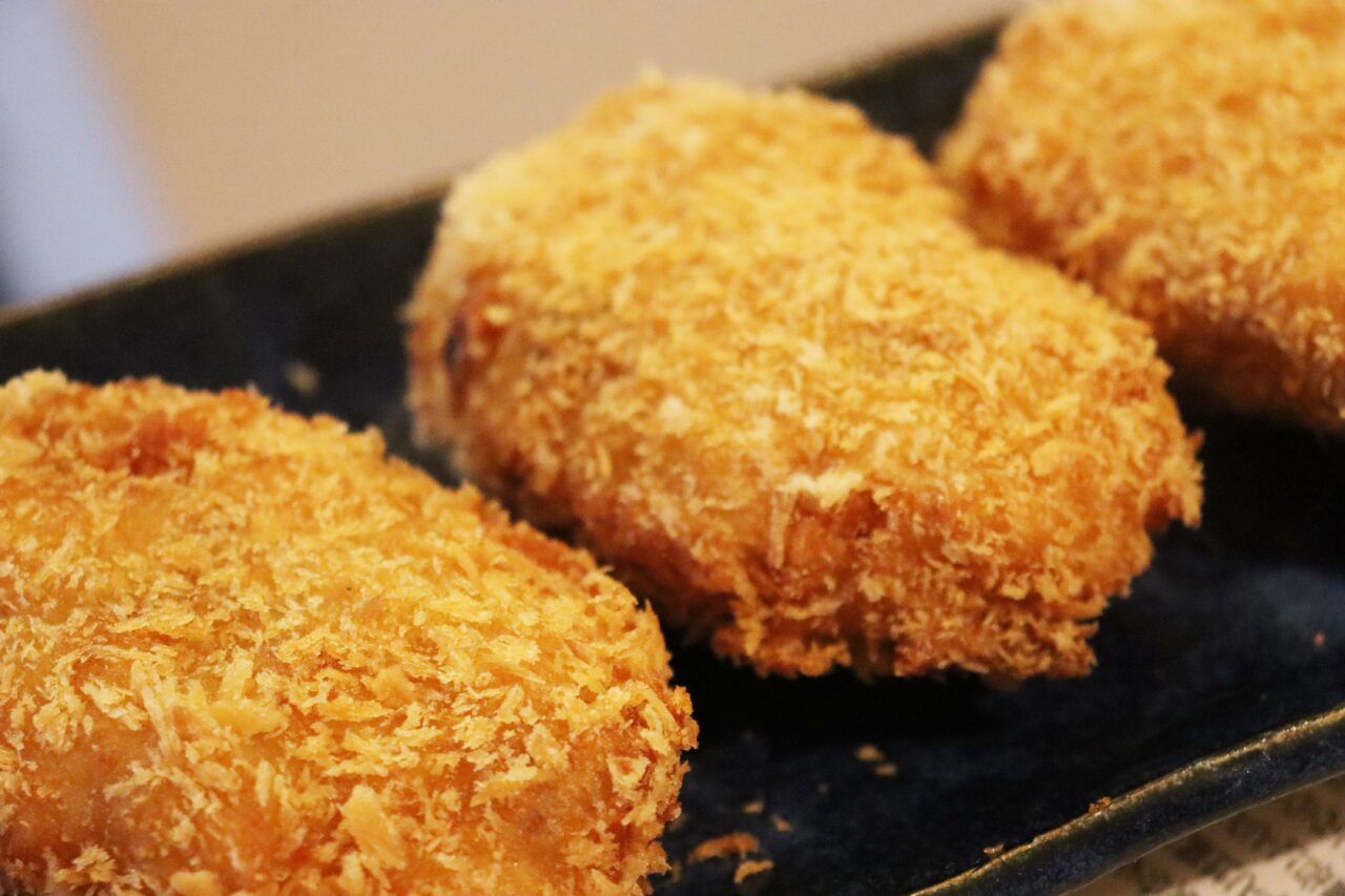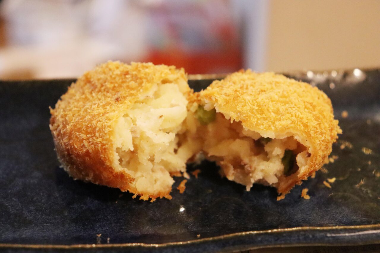 ごろごろとした大きめのじゃがいもが使われており、富山弁で言うところの「はんごろし」食感。グリーンピースも入っていますが、子どもたちは気にせずもりもり食べちゃうのも、まるぜんコロッケならでは。食べ応えと存在感があり、じゃがいもの甘みがしっかり感じられる一品です。