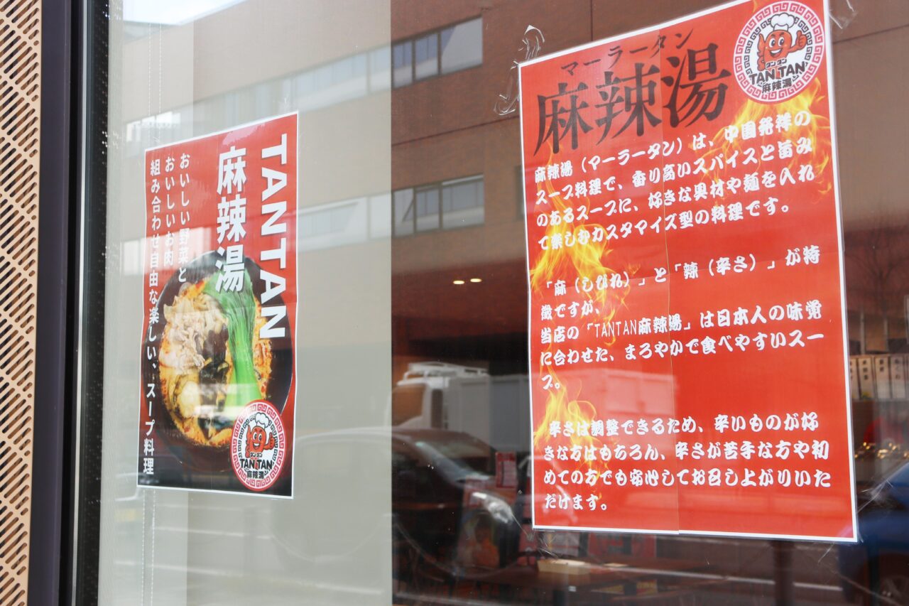 富山駅北口エリア、Dタワー富山1階の飲食店複合施設に、新たなお店が誕生しています。麻辣湯(マーラータン)専門店のTANTANが、2025年12月25日(木)にグランドオープンしました。店頭には大きなビジュアル看板や説明ポスターが掲示されており、花椒(ホアジャオ)のしびれと唐辛子の辛さが特徴の麻辣湯を、日本人の味覚に合わせてまろやかに仕上げていることが紹介されています。たっぷり野菜&低脂質スープで、春雨は馴染みの深い細さと平たく太いもの、そして食べ応え重視の方も大満足の中華麺から選べるようです。