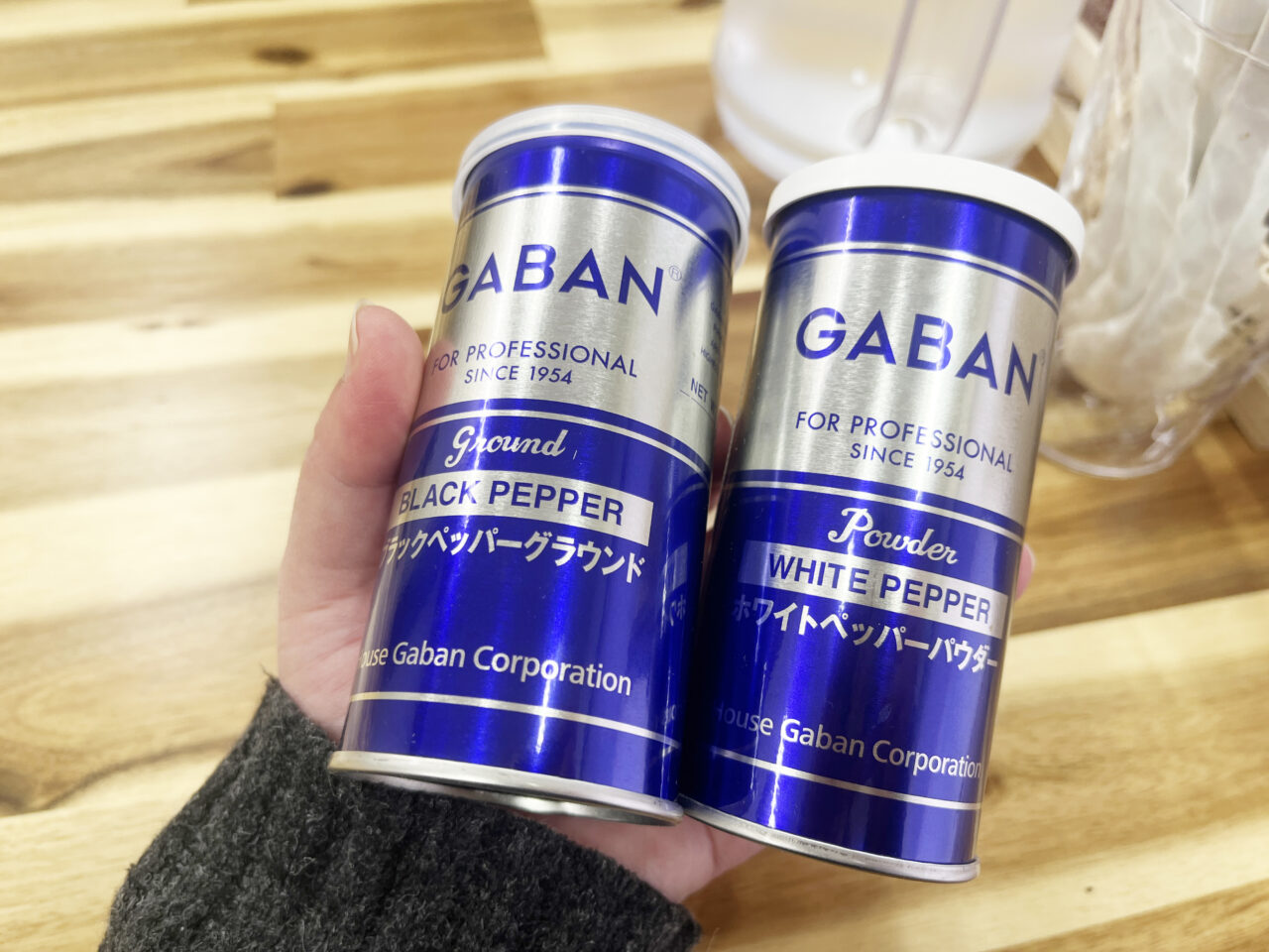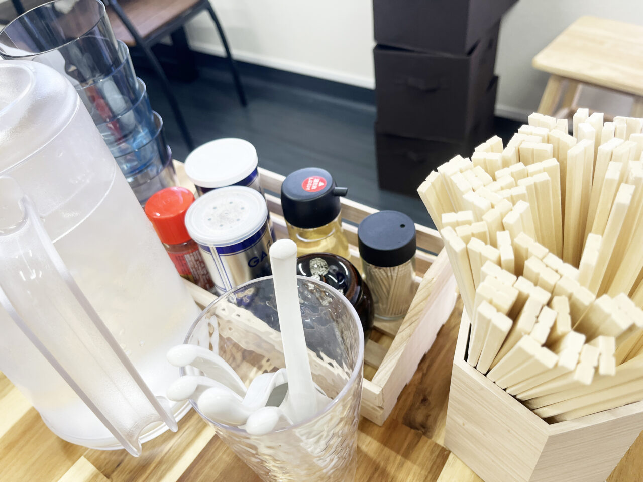 カスターセットには白胡椒・黒胡椒、ニンニク、一味、酢が。