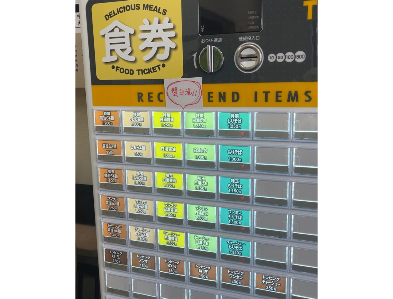 白湯(パイタン)は季節によって出汁が変わり、訪問時は蟹出汁とのこと。非常に魅力的でしたが、同行者に蟹アレルギーがあったため、今回は断念しました。ホワイトボードにも「カニアレルギー×」との表記が。