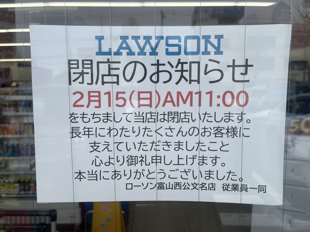 富山市西公文名町にある「ローソン富山西公文名(にしくもんみょう) 店」が、2026年2月15日(日)11時をもって閉店することが分かりました。 現地には閉店を知らせる案内が掲示されており、長年営業してきた店舗の閉店を惜しむ声も聞かれます。 この店舗について