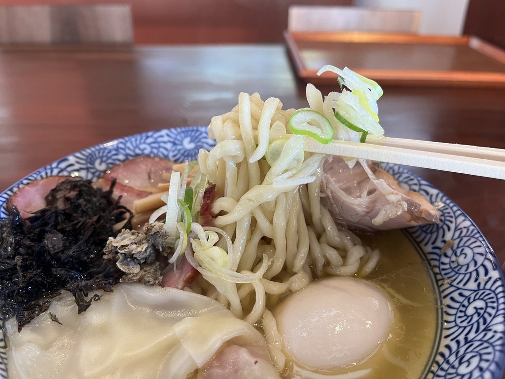 透明感のあるしじみ出汁の塩スープは、やさしい口当たりながらも旨みはしっかり。手揉み麺はもっちりとした食感で、スープとの相性も良好です。生姜の油がふわりと香り、後味を引き締めます。