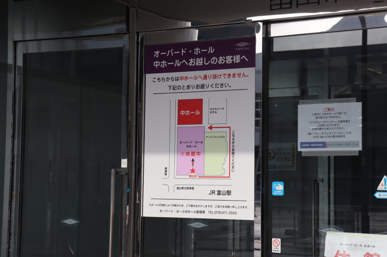 現在大ホールは工事中で休館中です。中ホールへ行く際に大ホールを通って行くことはできません。お気をつけくださいね!