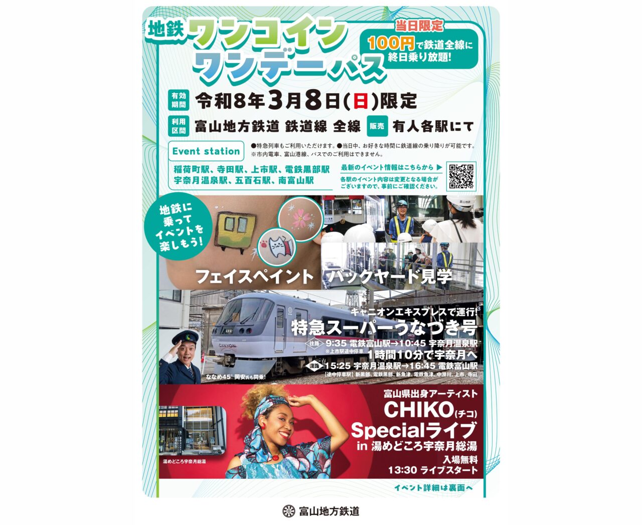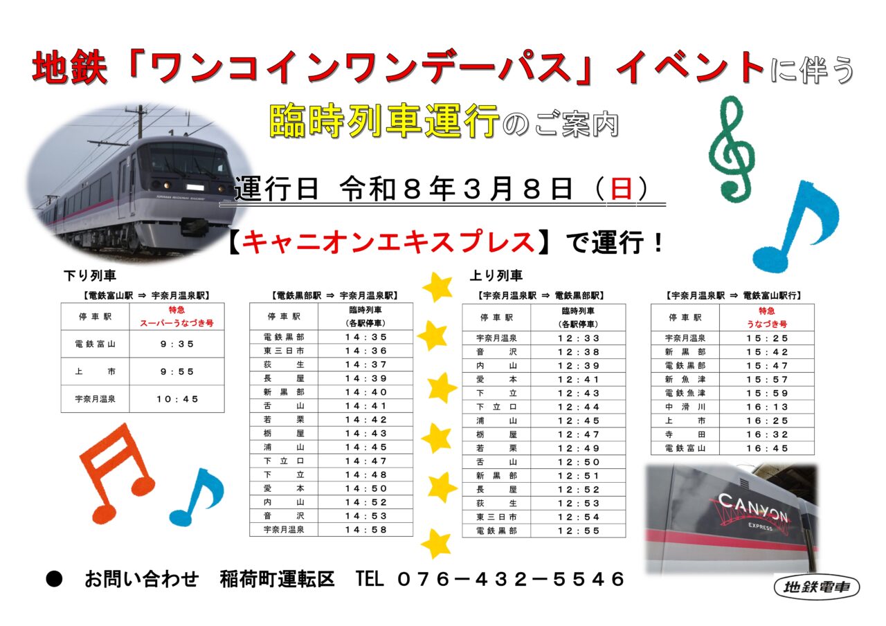 【富山市】100円で地鉄が乗り放題!? 2026年3月8日(日)1日限定ワンデーパスが登場!